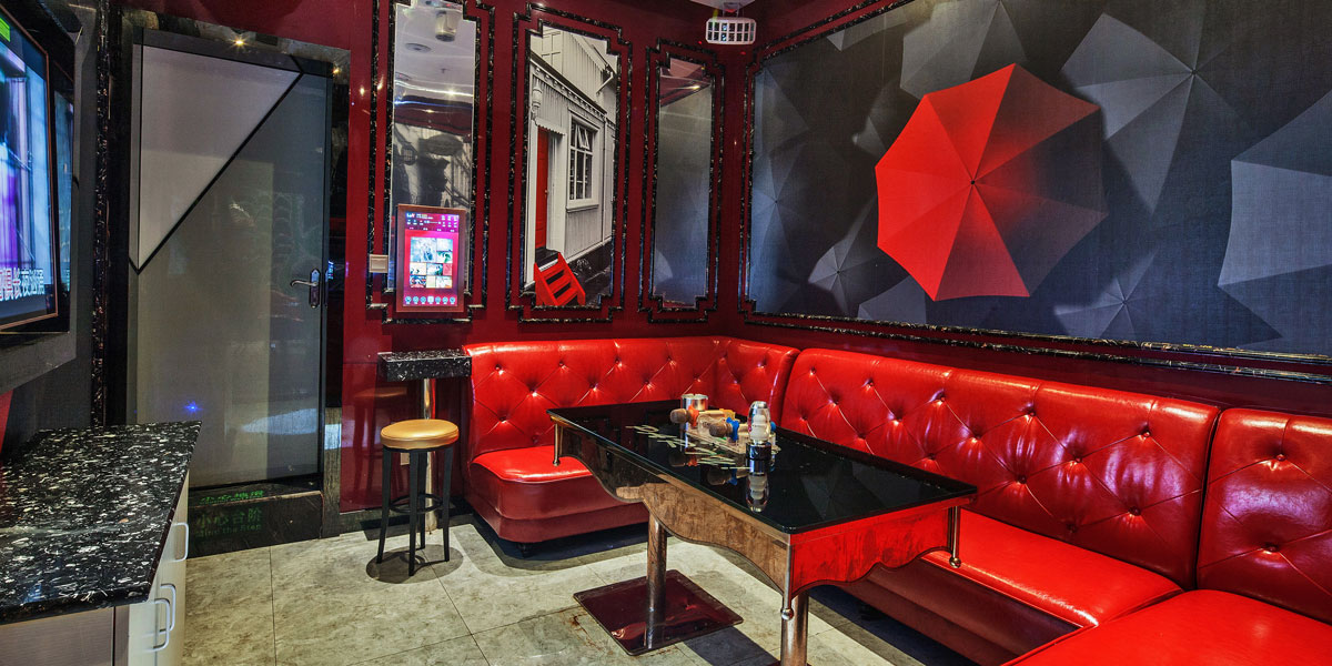 蓝色包房则设置成为花的海洋,典雅的地中海蓝充斥在整个房间内,大面积的透窗让空间拥有更广阔的通透感,藏蓝色卡座依次排开尽显典雅气派,吊顶线条自由流畅,并以花朵进行装点,静谧悠远,见证呼朋唤友的愉悦时光。红色主题包房则呈现出浓浓的酷炫气质,酒红色的真皮卡座霸气十足,墙壁黑色背景下的红色雨伞,夺人眼球,表达着不羁的张扬个性。