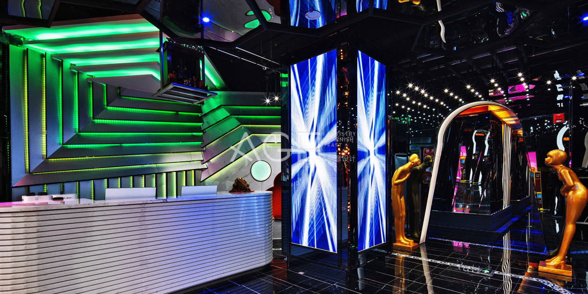 杨彦设计师摒弃了许多不必要的附加装饰,以平面构成、色彩构成、立体构成为基础进行空间设计,特别注重空间色彩以及形体变化的挖掘,凸显出色彩和线条的张力。前厅空间中,色彩和线条的运用张弛有度,地面铺贴黑色板材,上衬若隐若现的水纹图案,与白色前台柜形成视觉冲击。前台背景墙以立体线条装饰,内衬LED氛围灯,增强空间的层次感。立柱巧妙包裹成电子屏,扬长避短强化功能性,吊顶采用镜面材料,设置为蜂巢图案,形成交相辉映的视觉效果。前厅到走廊的过渡区,搭建五角星的造型,并安装氛围灯具,打造出群星璀璨的星光大道。