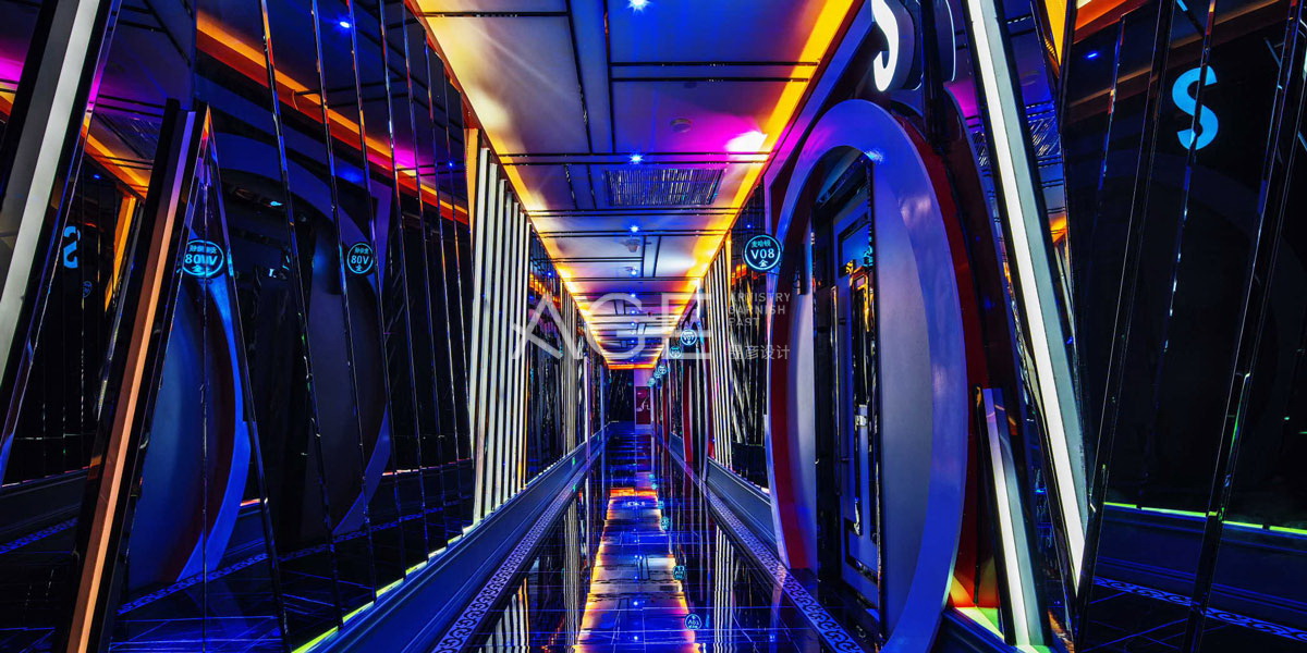 由星光拱门到走廊区域,仿若漫步在麦·哈顿的时代广场,璀璨夺目,独具魅力。走廊区域设计师通过线条的组合运用,简练的线条浅白色的吊顶和墙壁上延伸,凸显出硬朗的张力,并摆置迎宾小金人,体验来自百老汇的热情。两侧墙壁以镜面材质为主要材料,采用大面积的壁板来设计造型,或圆滑的弧线,或硬朗的直角,配合科学搭配的灯光体系,将墙壁造型和包房门巧妙融合,完美表达出精英时尚的魅力。