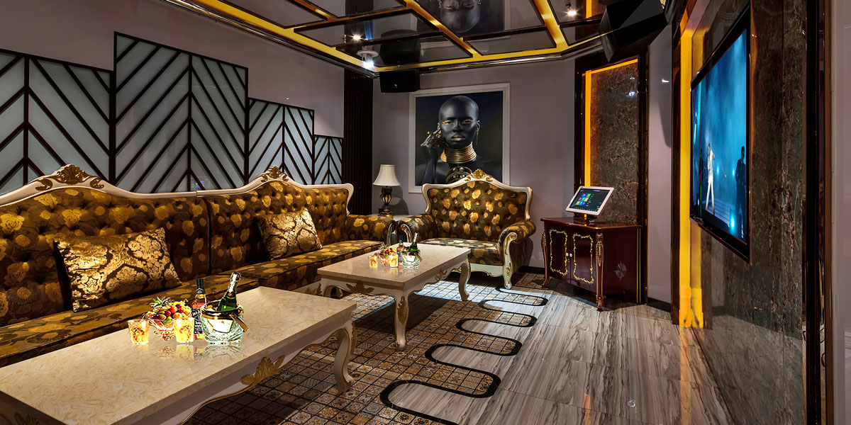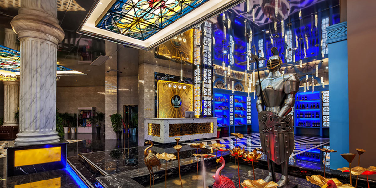 包间设计更为大胆,有的房间充满科技感,有的房间则主打梦幻色彩,不同空间散发出不同的诱人魅力。主打科技感的包间,创新性的将3D视觉效果元素融入到室内设计中,墙壁高清大屏,图像清晰,吊顶块状设计,完美结合,能够呈现出不同的视觉效果,一进去房间就仿若进入到海底世界,效果逼真,如梦如幻,带来超3D的全新感官体验,科技感十足。互动舞台空间通过灯光设计,营造出梦幻的氛围,吊顶设计中采用矩形几何体分割,内衬LED灯带,墙壁镂空位置暗埋小射灯,与大面积的高清大屏形成完整的灯光体系,变幻的灯光中仿佛进入魔方世界,效果震撼。主题大包间则将中西融合这一概念演绎到极致,选用蓝色紫色为主色调,点缀传统中国红,色彩高贵典雅,装点上精致的壁画,和谐统一。另一包间则将罗马柱作为空间的主要元素,装点彩色玻璃,将整个房间打造成为一幅油画,凸显出尊贵品位,典雅气质。