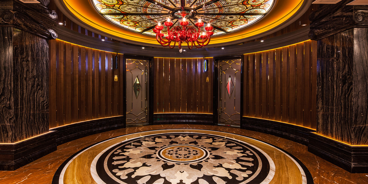 中山金玥商务KTV设计二期中运用了不同的展示方法,亮点突出,大气奢华。走廊吊顶采用穹顶设计,运用镂空、彩绘玻璃、罗马图案等元素,墙壁运用具有镜面效果的材质,暗埋线性造型的LED灯带,与吊灯形成完整的灯光体系,仿若星光大道一样的星光熠熠,走进别有洞天的另一片天地。